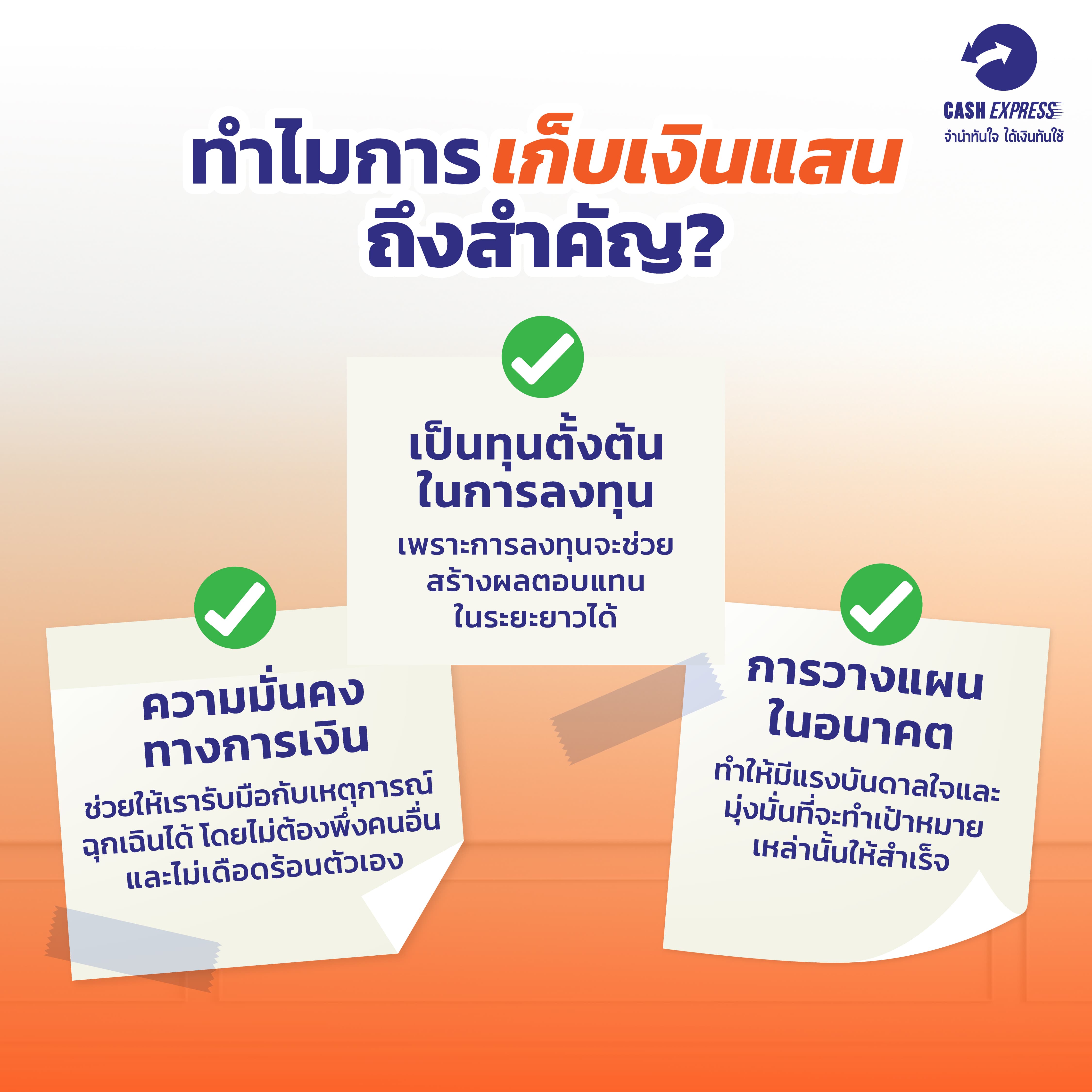 เพราะเมื่อเกิดเหตุการณ์ที่ไม่คาดคิด เช่น ภาวะเศรษฐกิจที่ไม่แน่นอน หรือเหตุฉุกเฉินส่วนตัว เงินออมจากการเก็บเงินแสนแรกนี้ก็จะสามารถช่วยให้เรารับมือกับเหตุการณ์ดังกล่าวได้โดยที่เราไม่ต้องก่อหนี้หรือพึ่งใคร และไม่ทำให้ตัวเราเองเดือดร้อน