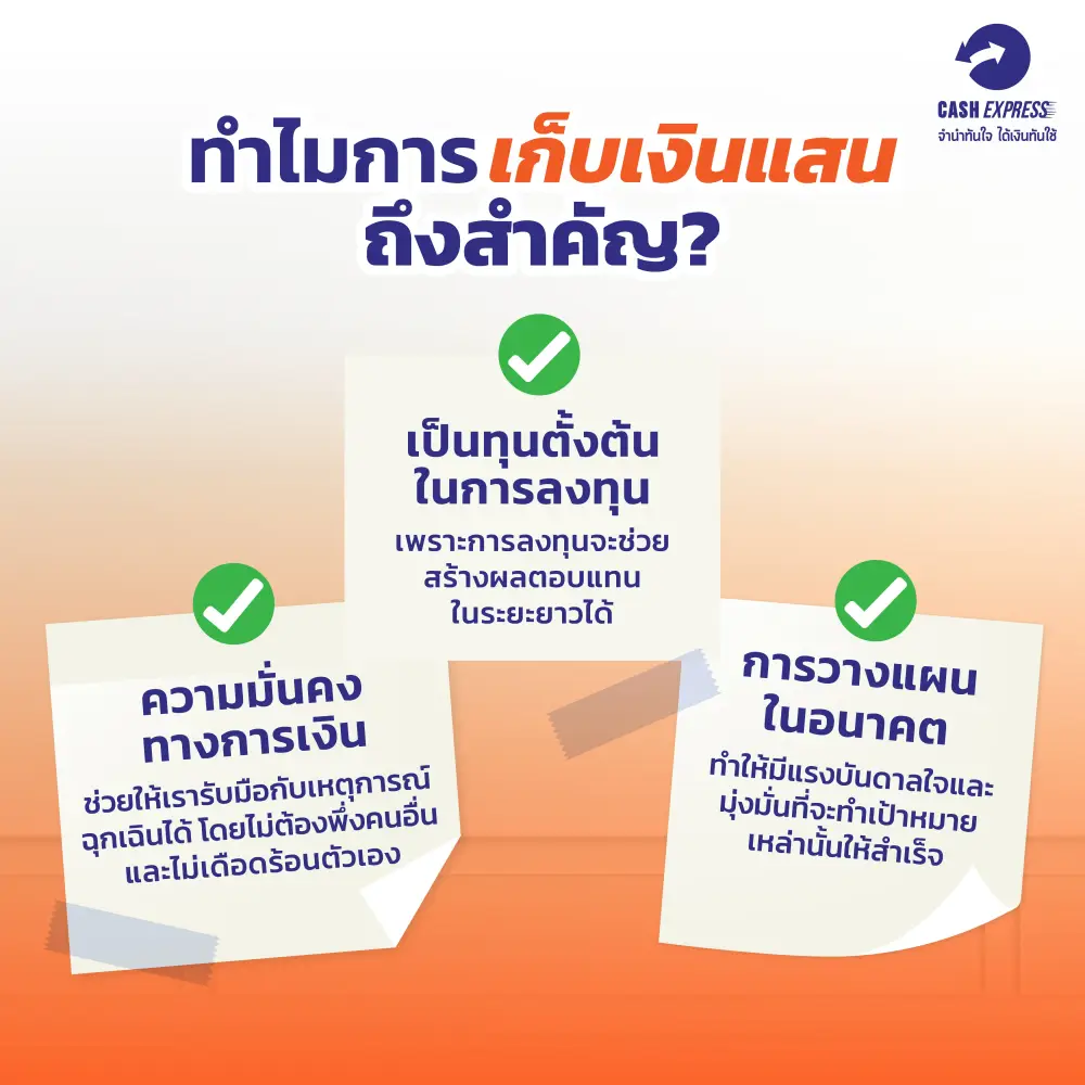 ก่อนที่เราจะไปอ่านวิธีเก็บเงิน เรามาดูเหตุผลกันก่อนดีกว่าว่าทำไมการเก็บเงินแสนแรกถึงสำคัญ ซึ่งการเก็บเงินแสนแรกหลายคนอาจมองว่ายาก ไม่สามารถทำได้ แต่ในทางกลับกันถ้าเราสามารถทำได้สำเร็จ มันคือก้าวสำคัญของ “อิสรภาพทางการเงิน” ที่จะต่อยอดให้เรามีวินัยในการออม และพร้อมสร้างความมั่นคงในระยะยาวได้ ซึ่งพี่แคชขอยกเหตุผลหลัก 3 ข้อ ดังนี้