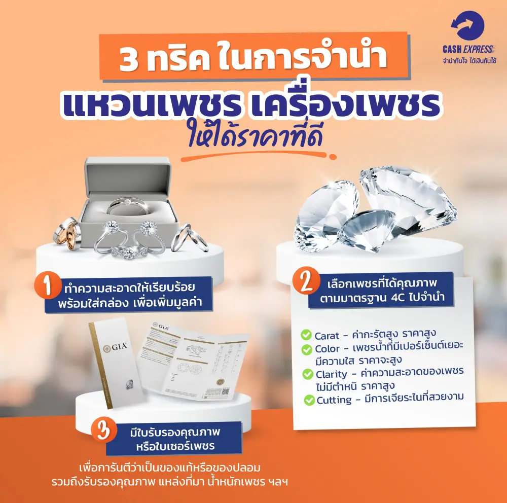 แน่นอนว่าแหวนเพชร เครื่องเพชรนั้นเป็นสิ่งที่มีมูลค่าสูง และหลายคนอาจพลาดกับเรื่องเล็กๆ ทำให้ได้เงินมาในราคาที่ผิดหวัง แต่จริงๆแล้วพี่แคชมี 3 ทริคง่ายๆ ที่จะทำให้ได้รับเงินมาในราคาที่ดีกว่าเดิม ดังนี้