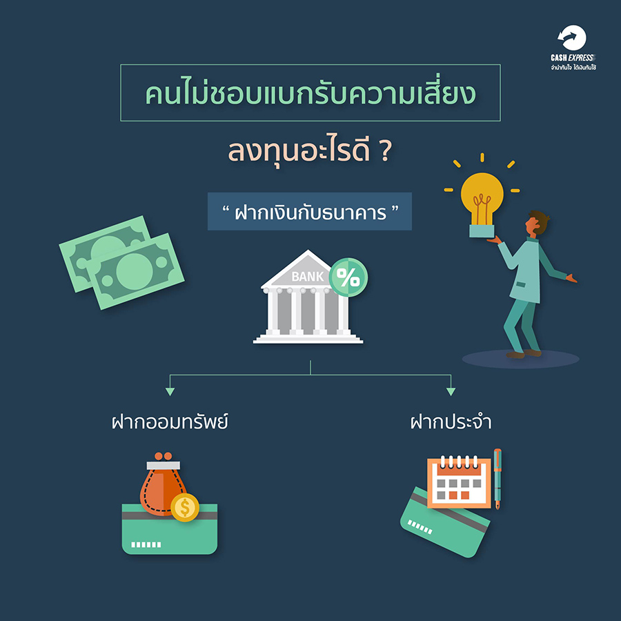 ทางเลือกที่ปลอดภัยที่สุดสำหรับคนที่ไม่สามารถแบกรับความเสี่ยงได้เลยก็คือการลดความเป็นไปได้ที่ทำให้เงินที่มีอยู่ลดลงโดยการออมเงินผ่านบัญชีเงินฝากประจำของธนาคารที่มีอัตราดอกเบี้ยสูงสุดที่ 1.1% ต่อปี และอีกหนึ่งทางเลือกที่พี่แคชแนะนำก็คือการออมผ่านบัญชีเงินฝากประจำที่มีอัตราดอกเบี้ยสูงสุดที่ 2% สำหรับบัญชีฝากประจำ 24 เดือน ซึ่งทางเลือกนี้ก็ต้องอาศัยวินัยในการออมอย่างสม่ำเสมอเพื่อให้ได้ผลตอบแทนที่คุ้มค่าเมื่อครบกำหนด